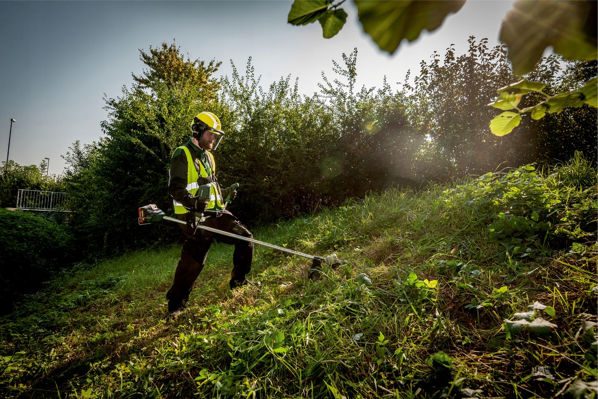 - Cicha mechaniczna kosa akumulatorowa z regulowanym uchwytem oburęcznym do wygodnej pracy na dużych powierzchniach